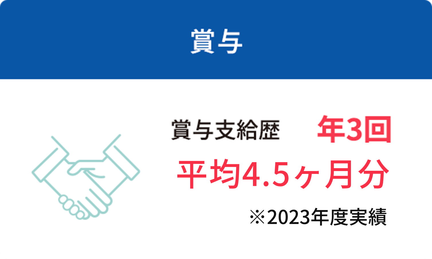 交通費規定支給(月2万円まで)、昇給制度、賞与制度(年3回、計5ヶ月分/前年度実績)、試用期間(6ヶ月)、各種手当(残業手当・深夜手当・休日手当・資格手当)